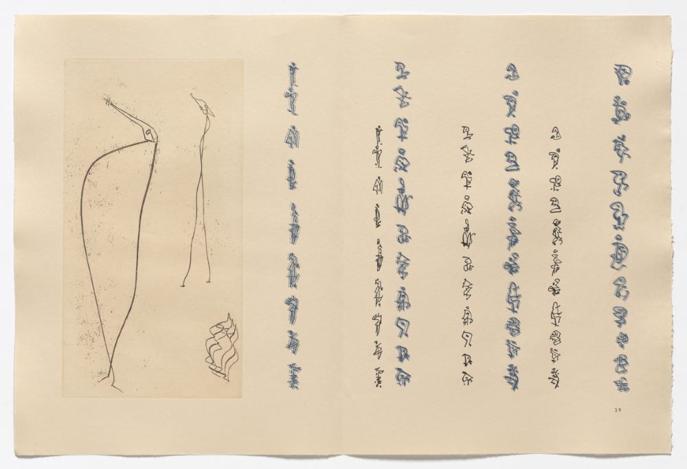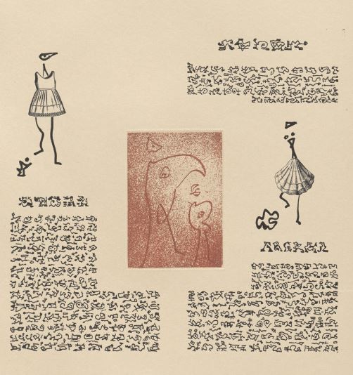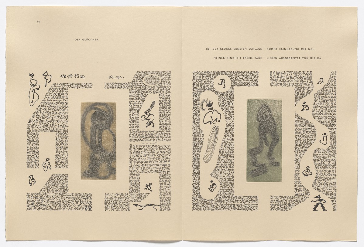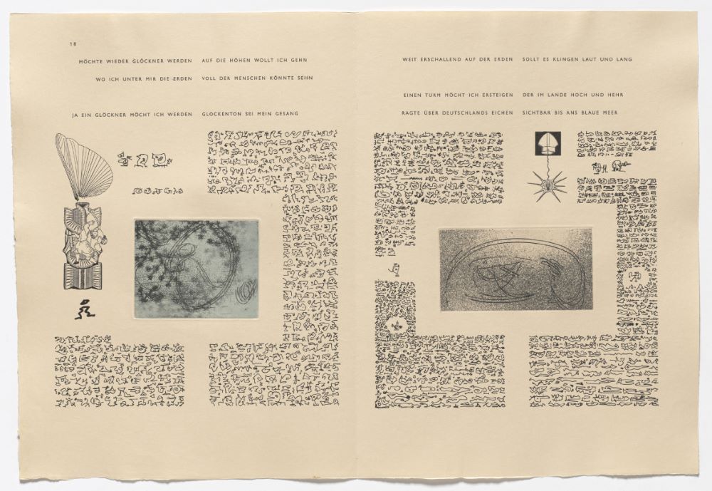 Особенность этих офортов в том, что здесь эта изобретенная письменность выступает как графика. Эти вымышленные знаки (в зарубежной литературе их именуют глифами [Drucker 1995, р. 232], а Макс Эрнст и Илья Зданевич называли их письменами) в книге присутствуют в разных вариациях: где-то они напоминают антропоморфные и зооморфные петроглифы, пиктограммы, в каких-то случаях они близки к символам древнеегипетского, где-то китайского алфавита или вообще непонятной письменности. Макс Эрнст долго и кропотливо работал над ними с помощью кальки, испробовав целый ряд вариантов в поисках окончательного расположения знаков [Gris-Bergmann 2017, p. 39]. Глифы в «Максимилиане» присутствуют на страницах: 2 – вводная часть, 3, 9, 23 – в полный разворот офорты с «письменами» Эрнста разделяют книгу на логические части. Во 2-й части книги они присутствуют в виде орнаментальных рамок, обрамляющих офорты. Эти изобретенные письмена завораживают, придают таинственности и словно намекают на неизведанные миры и тайные знания.