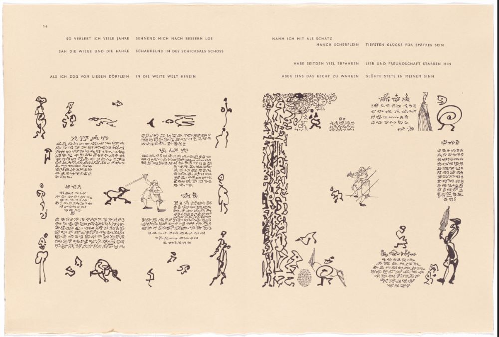 Во второй части книги текст располагается по горизонтали в привычной для чтения форме, но с необычным смещением абзацев. Эта часть содержит стихотворение Эрнста Темпеля на немецком языке, которое разбивается цитатами из его воспоминаний на французском языке. Здесь художественная типографика уступает место графике, практически ¾ страницы занимают офорты, обрамленные рамками из искусственно созданных письменных знаков (глифов) и пиктограмм, чаще в виде антропоморфных и зооморфных фигур. В некоторых из них угадывается фигура Лоплопа; они динамичны, создается впечатление, будто пиктограммы самостоятельно вошли в эти рамки, раздвинув их границы. Они оригинальны, декоративны и привлекают внимание.