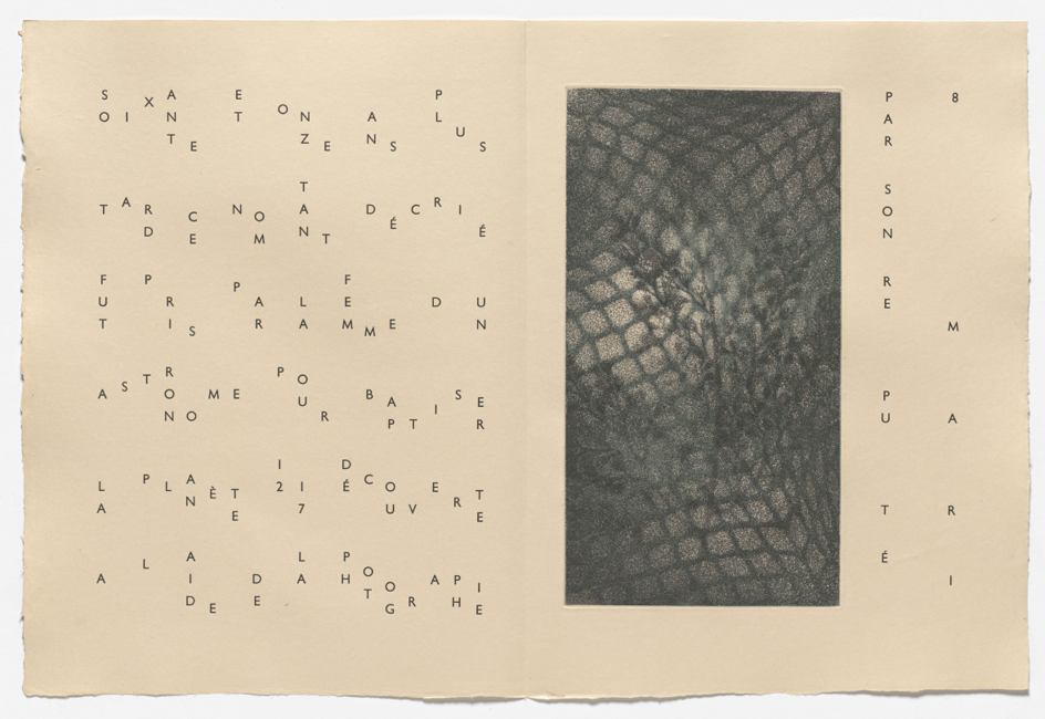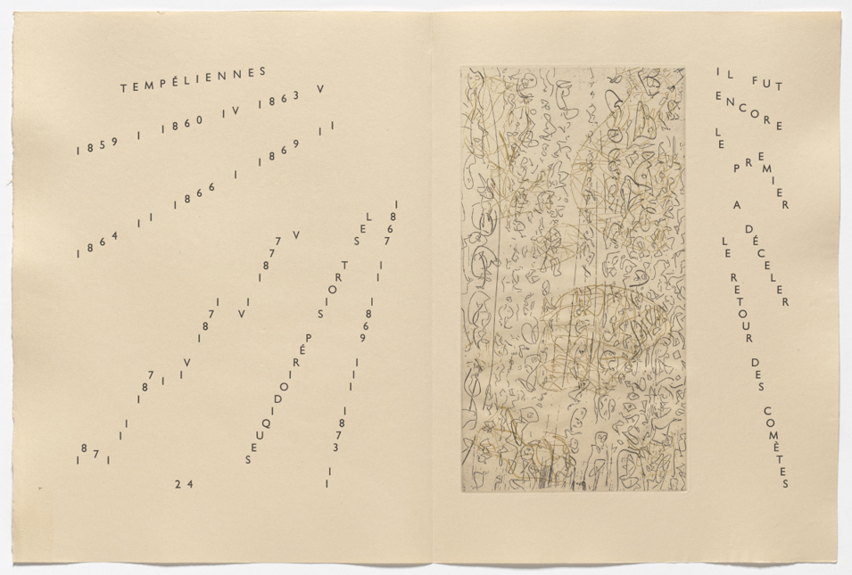 Результатом этого долгого исследования стала брошюра «Искусство видеть Гийома Темпеля» (фр. вариант написания имени Вильгельм), опубликованная специально для выставки “Hommage à Tempel”, в Галерее Le Point Cardinal в Париже 29 апреля – 30 мая 1964 года (ил. 6). Брошюра не уступала по богатству декора книге «65 Максимилиана, или Незаконное занятие астрономией», нестандартного узкого формата 315×115 мм тиражом 70 экземпляров. Оригинальный офорт Макса Эрнста с абстрактным изображением, напоминающим человека-птицу – Лоплопа, его излюбленного персонажа, напечатанный в монохромной коричневой гамме, с авторской подписью карандашом. В переплете из кожи ската с подписью Жоржа Леру, на старинной японской бумаге, включающая 12 черно-белых фотографических репродукций, брошюра открывала публике вновь и в новом ключе имя незаслуженно забытого ученого Эрнста Вильгельма Леберехта Темпеля (1821–1889), первооткрывателя 5 астероидов[6] и 12 комет, туманности Меропа в Плеядах и 183 объектов [Bianchi et al. 2010, р. 43‒51], внесенных в каталог NGC (New General Catalogue). По специальности Темпель был художником-литографом. Он, не будучи астрономом по образованию, открыл важные астрономические объекты, но при этом его коллеги в большинстве своем не хотели признавать в нем ученого астронома.