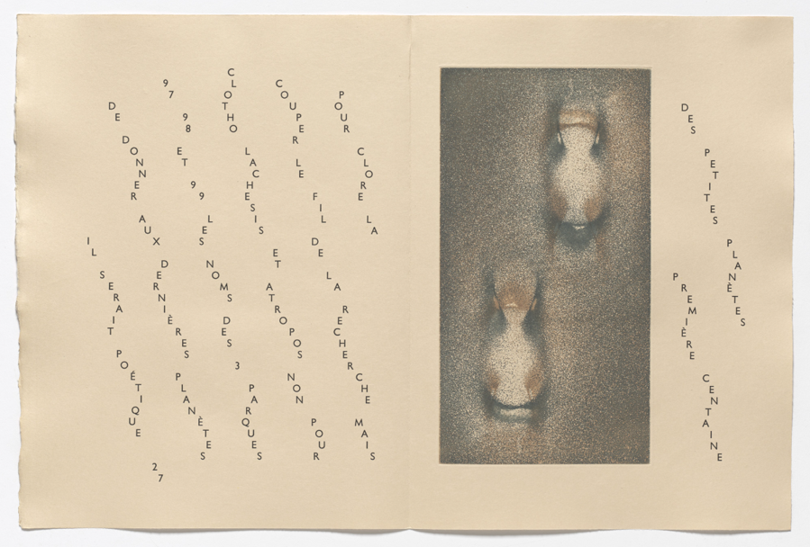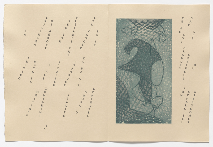 Книгу иллюстрируют 34 офорта Макса Эрнста. Все они представляют собой абстрактные изображения, часто на грани фигуративности. Используя сдержанную палитру охристо-серых тонов, местами со вставками ярко красных оттенков, Макс Эрнст делает больший акцент на объемности, ощущении глубины пространства. Это ощущение он создает, применяя принцип наложения друг на друга повторяющихся элементов в уменьшенном и увеличенном размере разным цветом, создавая впечатление объекта и тени, тем самым углубляя пространство, а также путем высветления участков вокруг или рядом с фигурой, создавая иллюзию света, идущего как бы из глубины изображения. Офорты очень гармонично включены в конструкцию текста. Они охватывают темы космоса, природы и человека (в каких-то из них читаются небесные тела, спирали галактик, абстрактное изображение туманностей, ботанические, зооморфные и антропоморфные формы). В этих абстрактных изображениях безошибочно угадывается изображаемый объект [Greet 1982, p. 12]. Офорты, расположенные по центру страницы, являются неким намеком, воссоздают мотив, который ориентирует читателя [Castleman 1995, p. 33].
