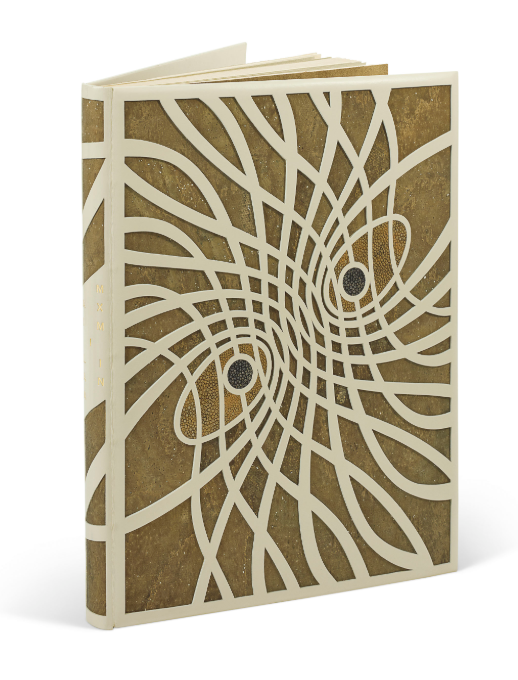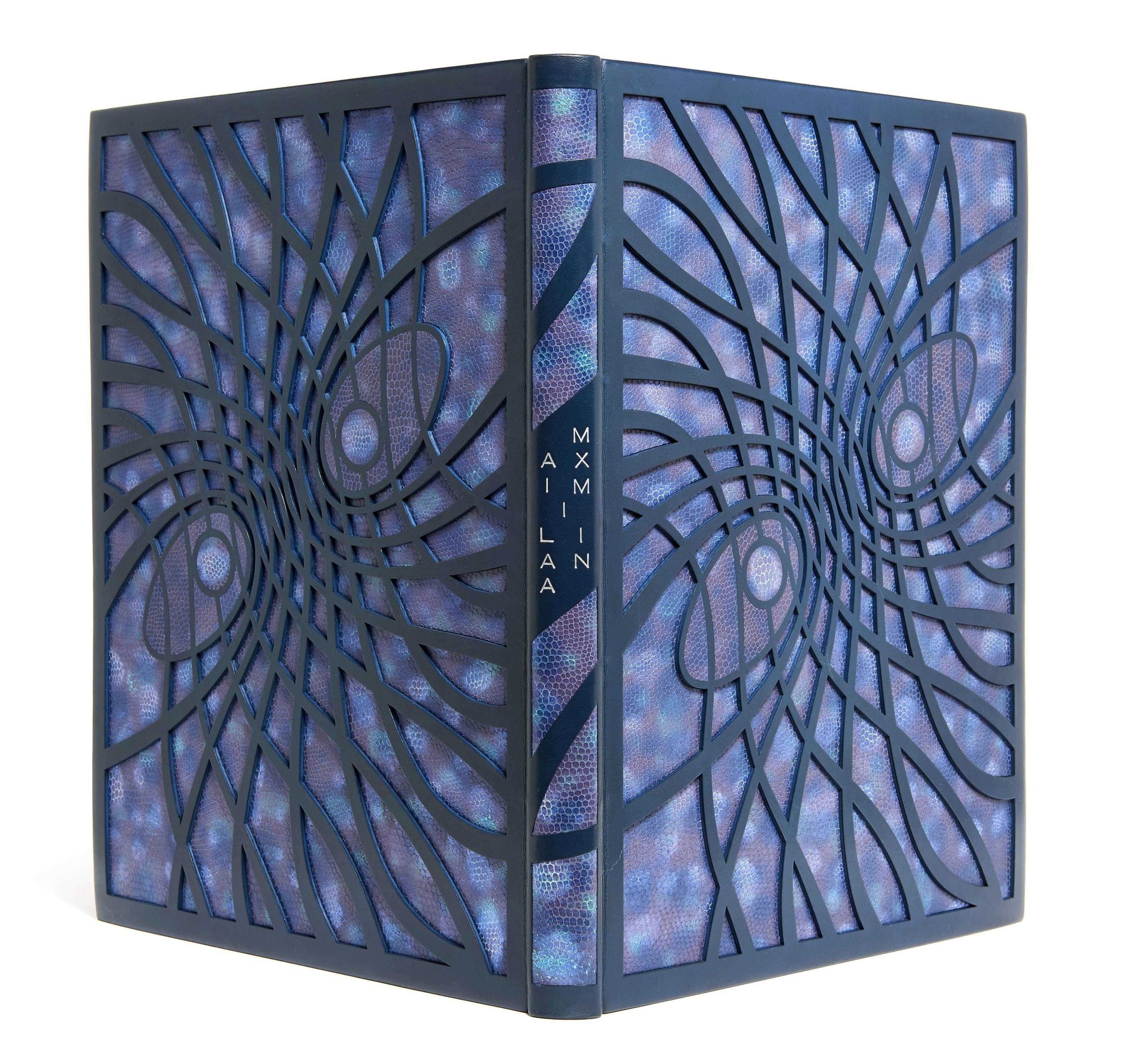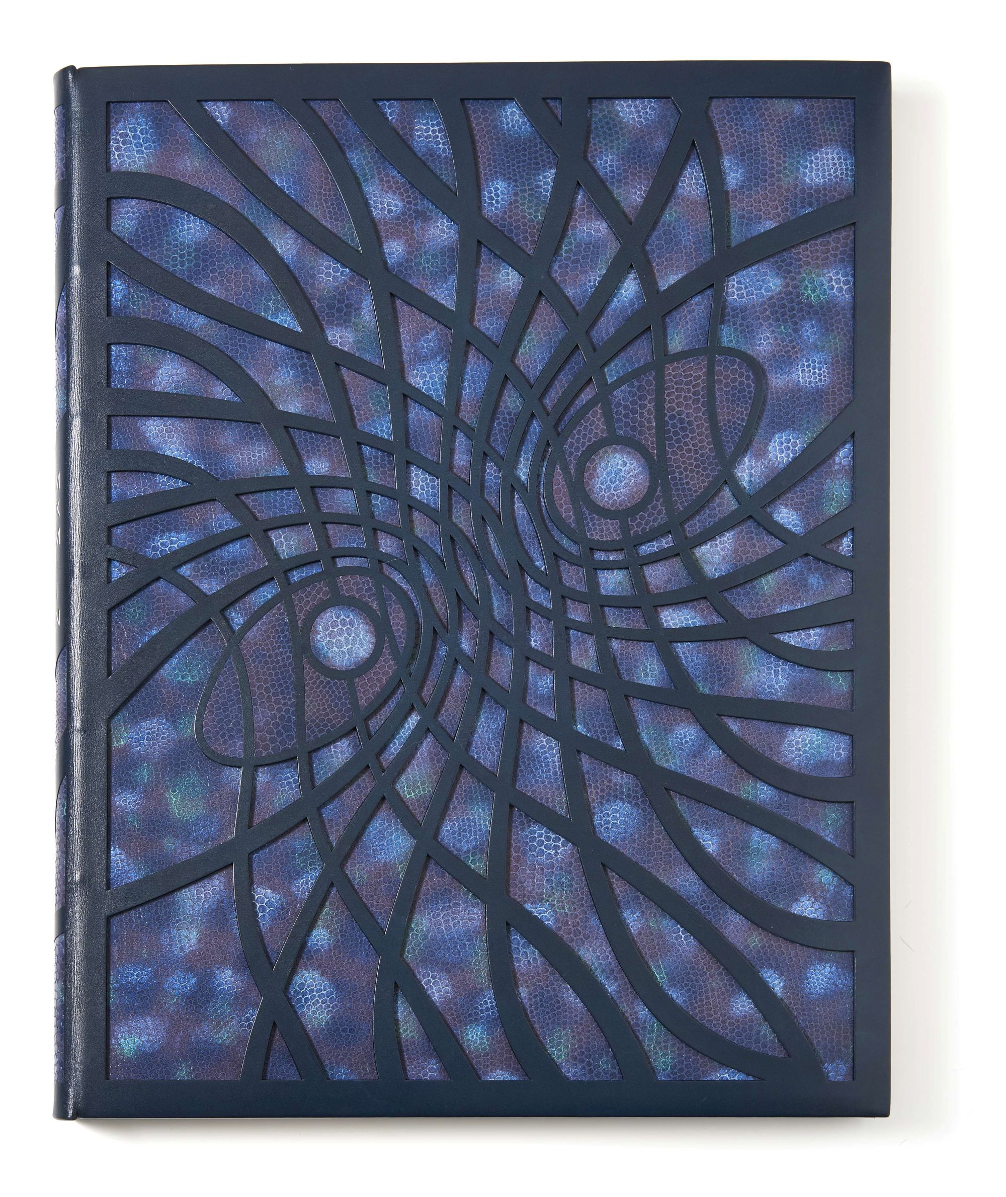 Пергаментные обложки книг данного издания уникальны для каждого отдельного экземпляра книги, рассмотрим два варианта: в синем цвете (экземпляр № 6), сделана из комбинации воловьей кожи (верхняя часть) и кожи ската (нижняя часть), они отличаются фактурой и цветом, что создает ощущение глубины и пространства. Другая – молочно-бежевого оттенка (экземпляр № 48) – это сочетание кожи вола (верхняя часть) и пробкового дерева (нижняя часть). Рисунок обложек выполнен по эскизу Макса Эрнста в форме двух эллипсов, и пересекающихся волнообразных линий, напоминающих объекты вселенной, или два смотрящих глаза (как известно, образ глаза – один из главных мотивов творчества Макса Эрнста – наблюдающая вселенная). Переплет был выполнен Жоржем Леру, одним из лучших переплетчиков-декораторов XX века, совместно с Ивоном Браманте. Каждый экземпляр имеет картонный футляр, подписан издателем и иллюстратором (ил. 7–9).