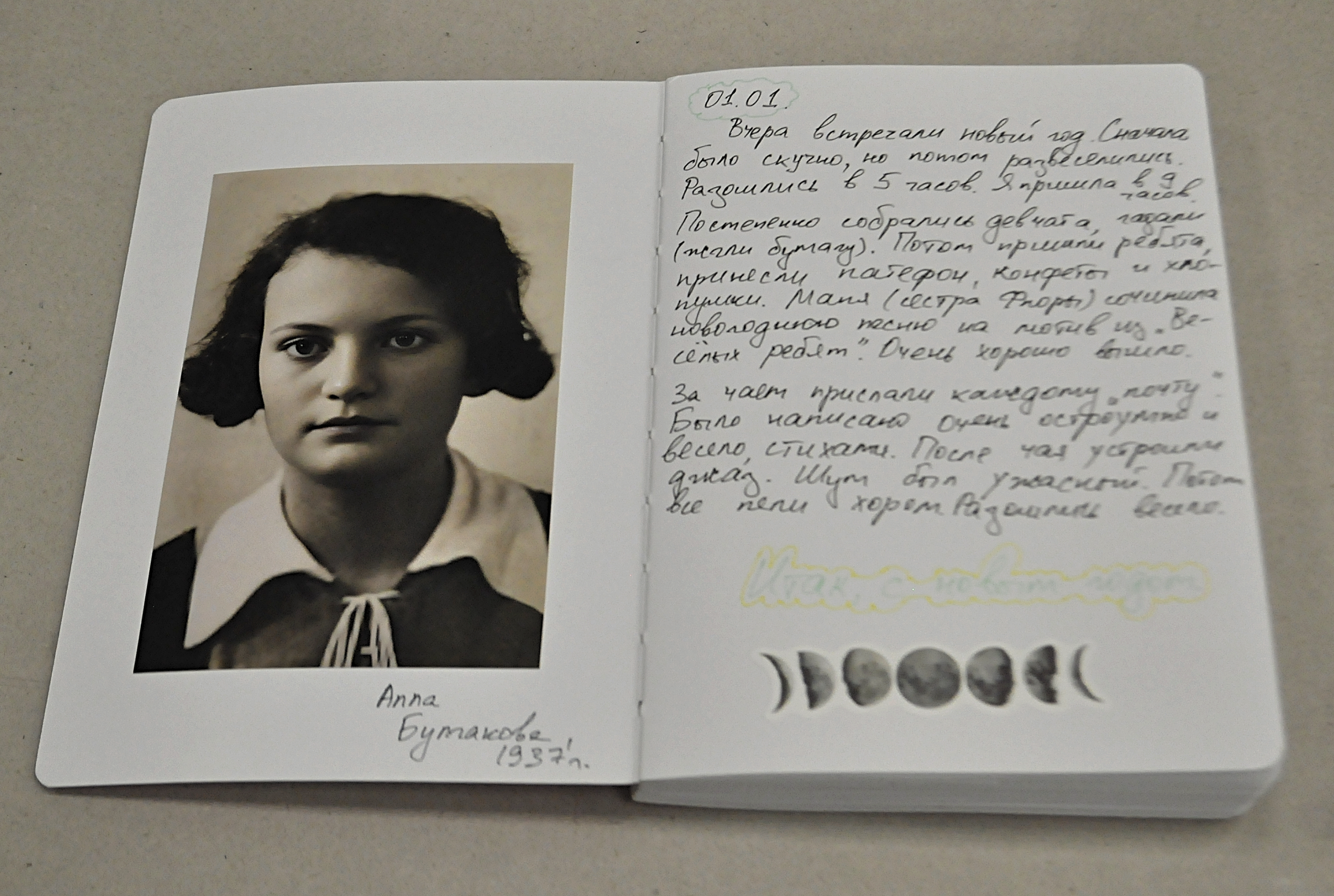 Главной целью было, чтобы группа успела произвести определенное количество завершенных работ по мотивам одного из дневников, предоставленных Центром «Прожито»[6], или других эго-документов (своих личных, семейных, найденных анонимных) ‒ в любом жанре и форме: графическая серия, объект, инсталляция, «книга художника», зин и т.д. Методология лаборатории основывалась на следующих принципах и концепциях: во-первых, интермедиальность как свод различных способов взаимодействия текста и изображения, способных порождать новые смыслы и контексты; во-вторых, идея общего прошлого и «мнемонической солидарности»[7], за счет которой современный читатель дневника ХХ века способен живо и ощутимо поставить себя на место автора, записывающего свои впечатления и мысли внутри другой эпохи, и создать произведение в «соавторстве» с ним, несмотря на временну́ю и культурную дистанцию; и наконец, в-третьих, идея «способности каждого человека быть творящим субъектом», восходящая к утверждению Йозефа Бойса, что «каждый человек ‒ художник» [Бишоп 2018, с. 371].