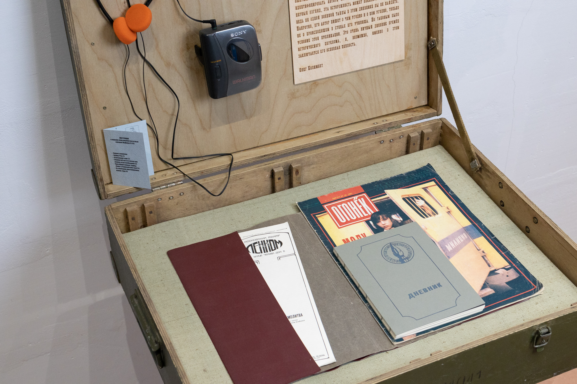 Самым крупноформатным боксом в экспозиции была работа фотографа, мастера авторской фотокниги Олега Колимбета «Приятное заблуждение. Дневник курсанта», основанная на анонимном дневнике молодого человека на сломе эпох (1990–1992). «Идея проекта ‒ пишет Олег, ‒ погрузить зрителя в контекст времени, в котором был написан Дневник, и предложить ему вступить с этим временем во взаимодействие: не только визуальное, но и аудиальное и тактильное». Внутри бокса, который представляет собой деревянный армейский ящик советского времени с нанесенным на крышку трафаретом черной краской названием, находятся: кожаная папка с артефактами времени, имеющими отношение к дневниковому повествованию ‒ журнал «Огонек» (август 1991), программка спектакля «Поминальная молитва» (Ленком, начало 90-х), обложка от VHS-видеокассеты «А.Д. Сахаров. Завещание» (1991), ‒ и собранная вручную в единственном экземпляре книга «Дневник курсанта» тетрадного формата. (ил. 3).