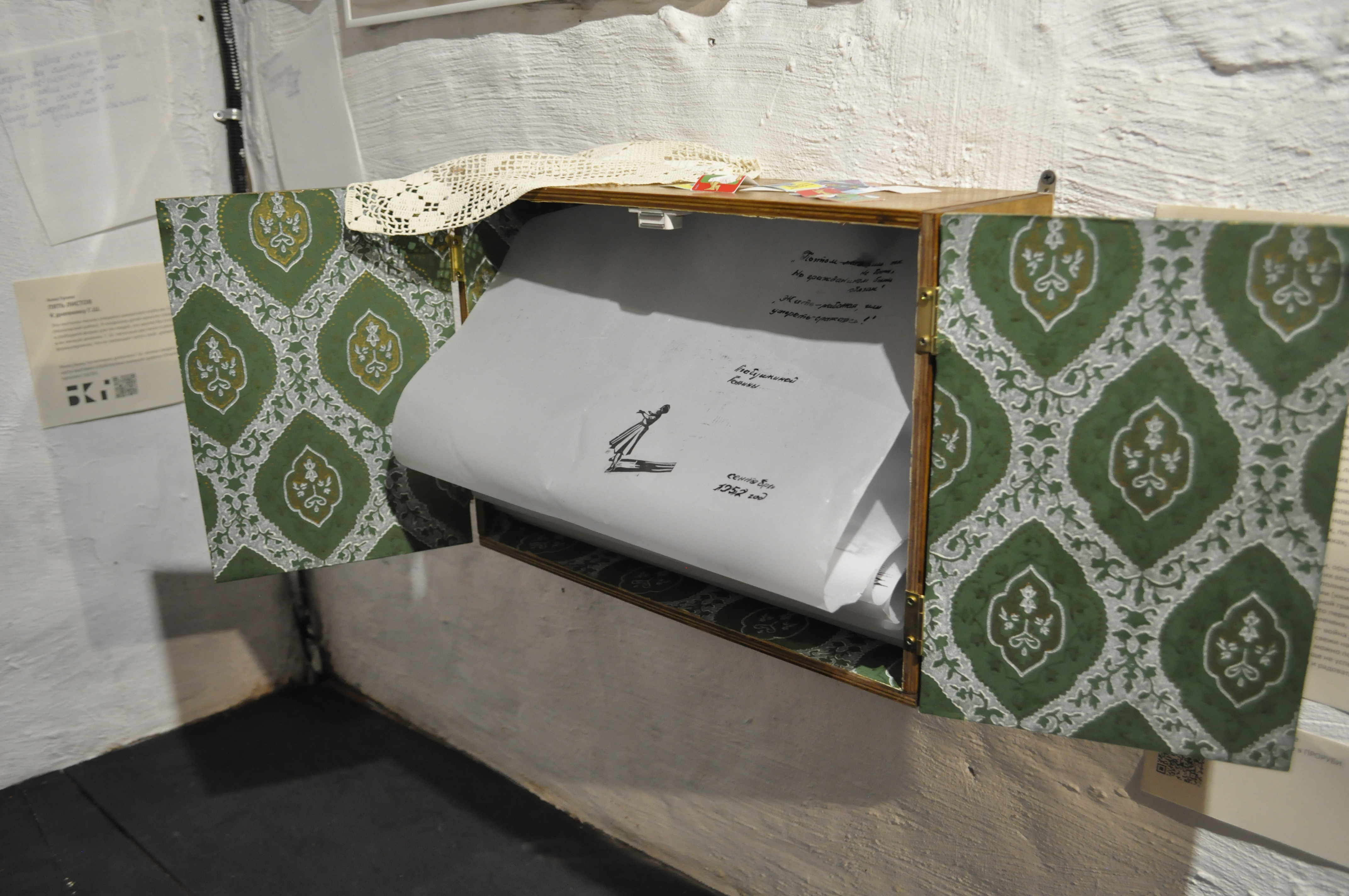 Работа Милы Деларовой «Бабушкин шкаф» также представляет собой гибридный объект, но еще более многосоставный: книга-конструктор с фанерными крышками, основанная на стихотворном дневнике бабушки художницы, ее рассказах и воспоминаниях внучки, и уменьшенная копия платяного шкафа, наполненного серией линогравюрных иллюстраций из книги, цитатами из дневника и артефактами.