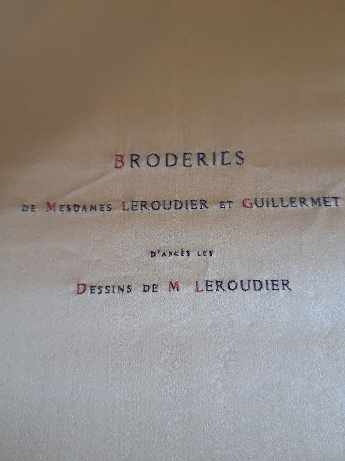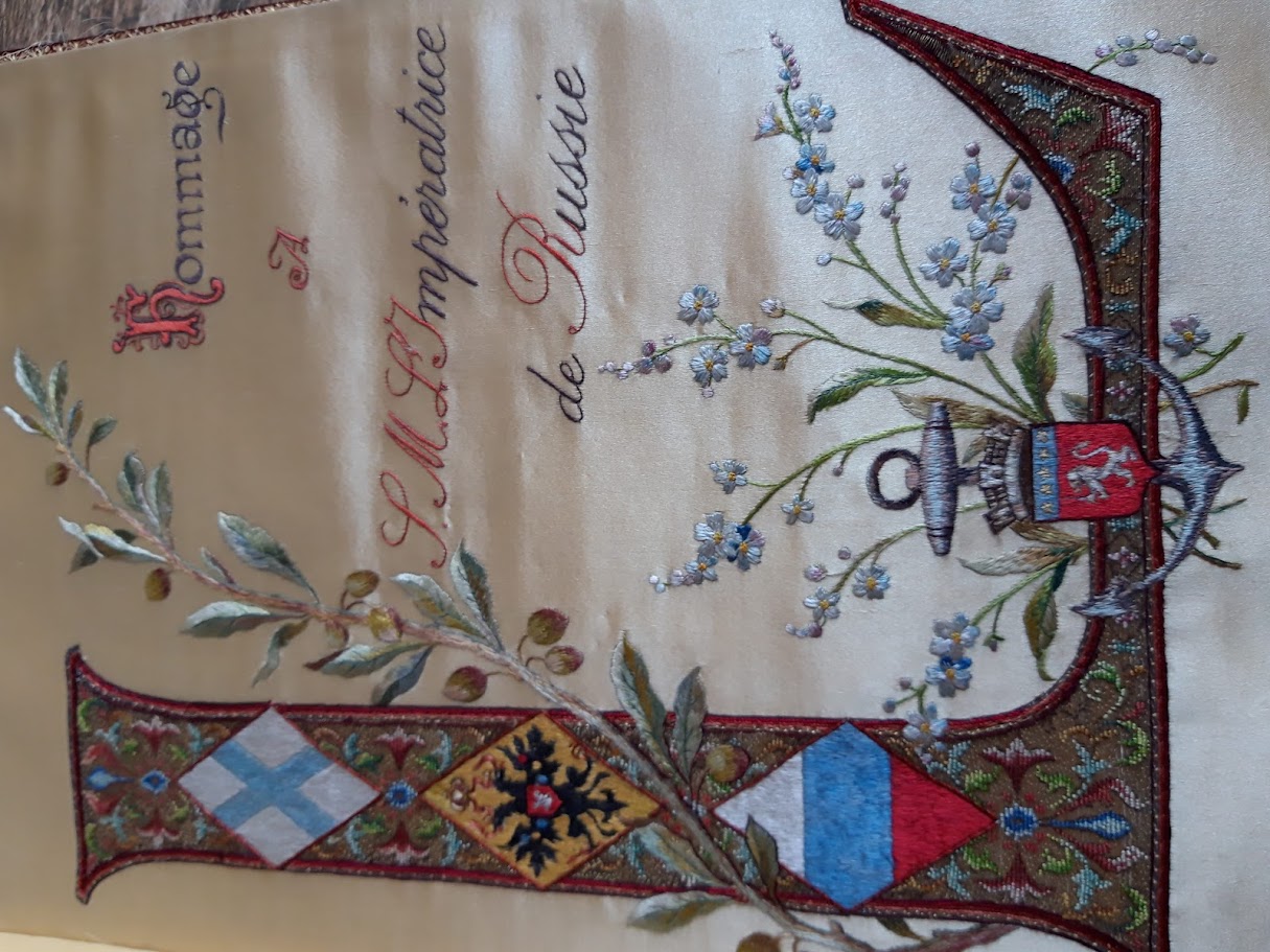 На обложке в центральном овальном картуше размещен герб города Лиона в окружении русского и французского флагов. На титульной странице на желтом шелковом фоне – гербовые щитки, выполненные цветными нитями в технике живописной глади. На следующей – посвящение русской императрице на атласе, расшитом шелком и металлическими нитями. Далее следуют страницы с вышитыми стихами Жана Экара, которые были написаны специально для этого издания.