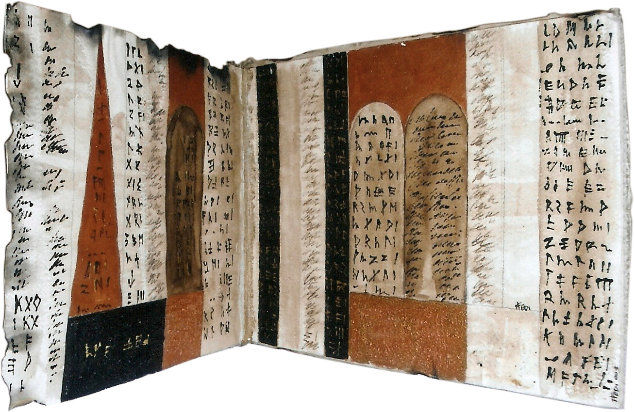 Во-первых, книга художника опирается на весь богатейший опыт передачи информации – от наскальных рисунков, берестяных грамот, глиняных табличек, древних манускриптов и первопечатных фолиантов до ультрасовременных медиатехнологий. Причем этот опыт не просто цитируется или микшируется, как это принято в постмодернизме, но подвергается творческому переосмыслению, развитию и синтезу.