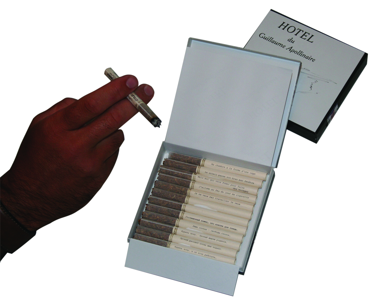 Так, книга «Отель Гийома Аполлинера» (ил. 13) (М.В. Погарский, Гюнель Юран) была отпечатана на папиросах, и один из экземпляров был выкурен на открытии выставки (ил. 14). Насколько мне известно, участники акции до сих пор бережно хранят строки-окурки выкуренного стихотворения как музейные артефакты. Но даже если отвлечься от всевозможных диковинок, любая книга классической формы (кодекс, свиток, гармошка) предполагает перелистывание, разворачивание, прикосновение, и в этом тактильном контакте всегда есть некая художественная магическая процедура, которая не так ярко выражена в обычных книгах.