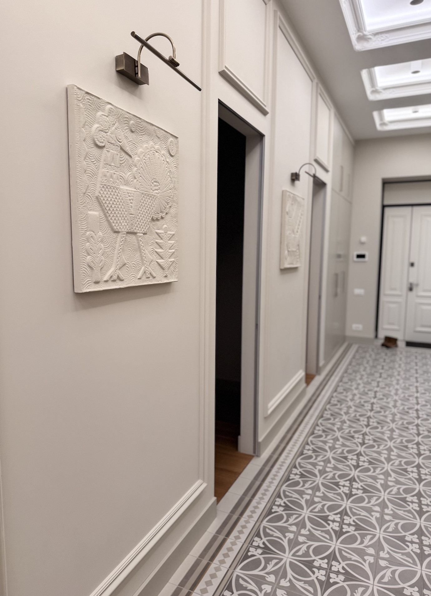 Проводя первичную оценку состояния панно, мы пришли к выводу, что, несмотря на имеющиеся повреждения, данные барельефы обладают исторической ценностью и их восстановление может стать интересным культурным проектом. В связи с этим было принято решение продолжить восстановление панно. Работа заняла четыре месяца, после чего панно были размещены в интерьере жилого помещения (ил. 4).