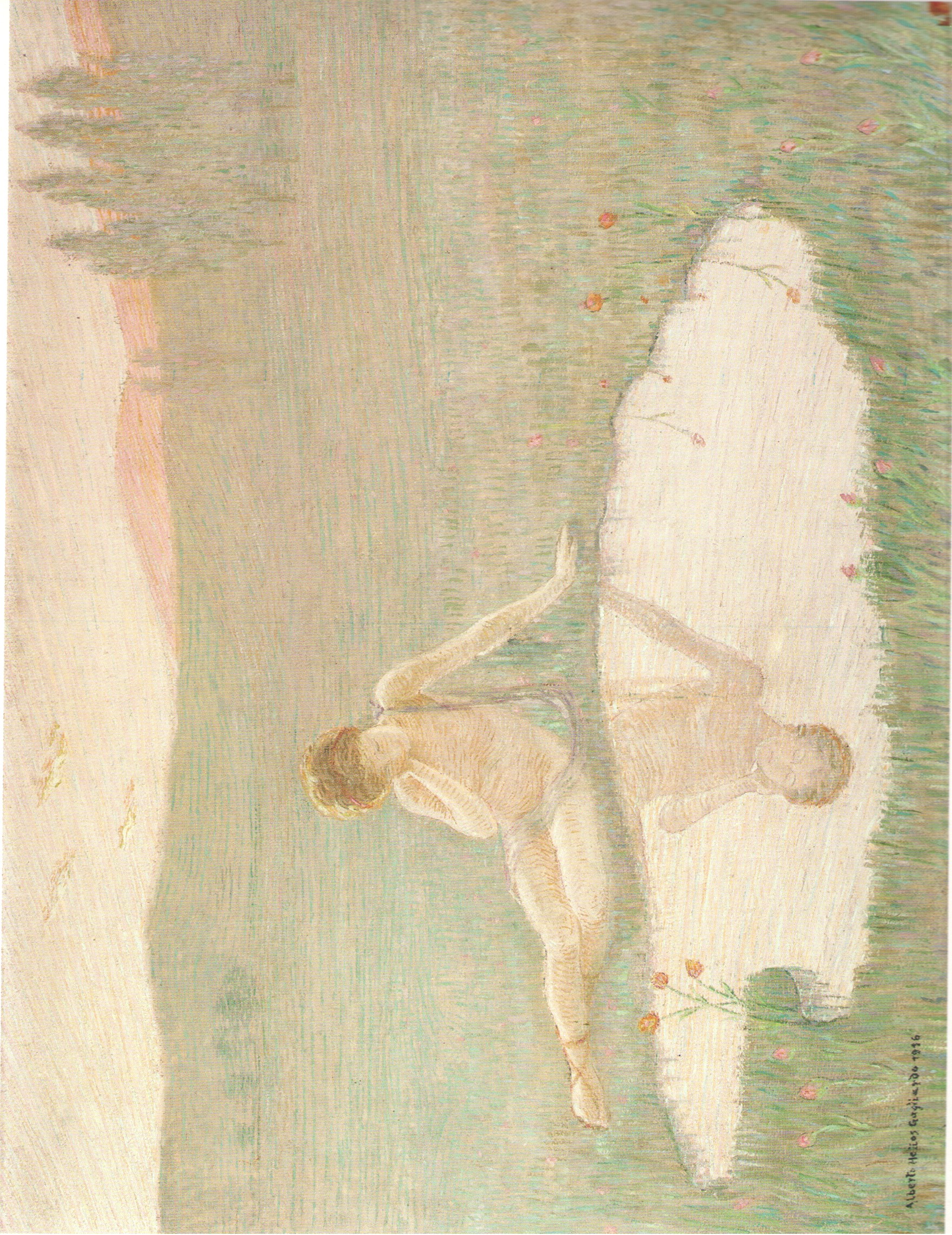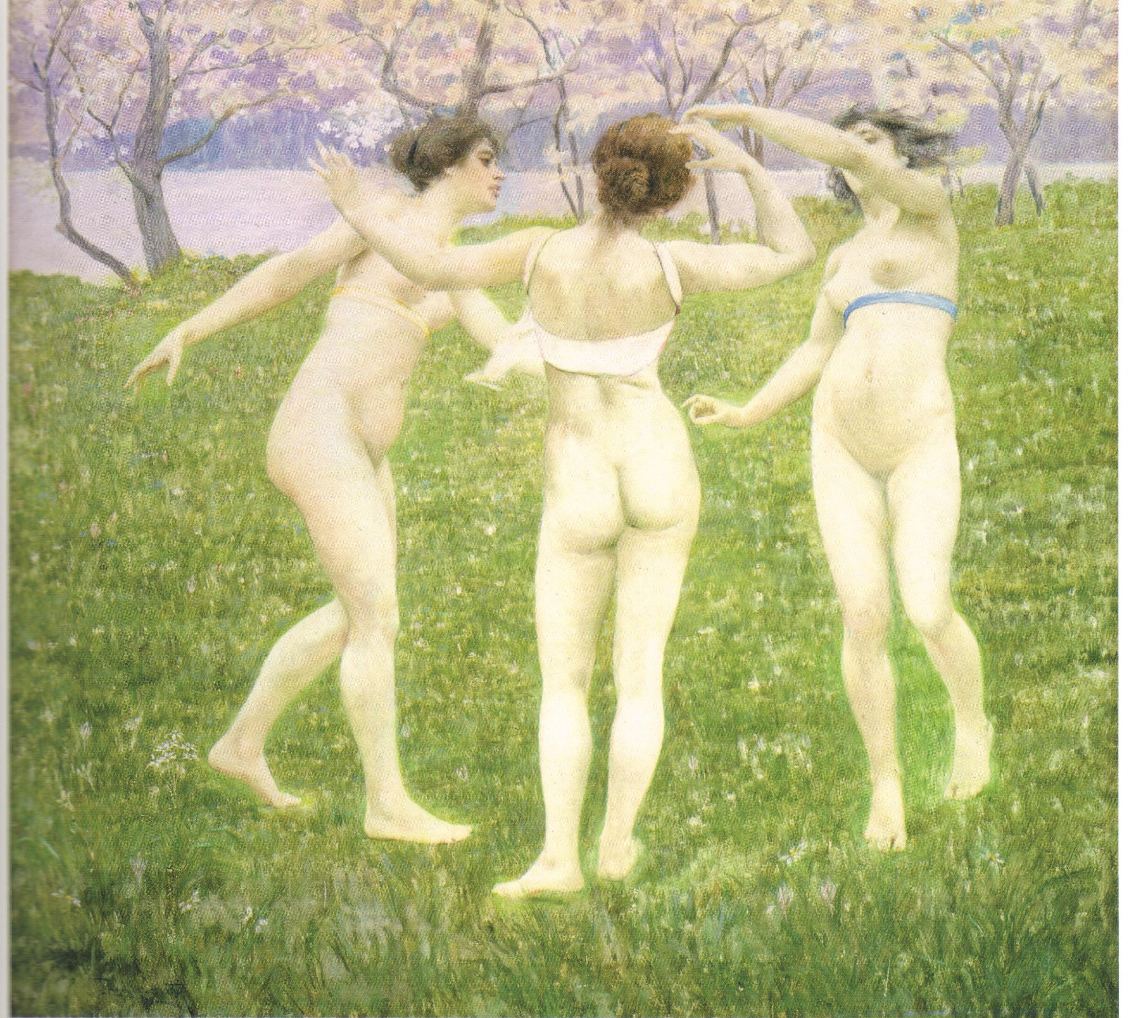 Итальянские художники этого периода редко использовали прямые цитаты из известной античной живописи. Сохранившиеся фрески из Помпей и Стабий – здесь можно, например, вспомнить фреску «Гора» (Стабии, 1 век н.э.) или известную мифологему трех граций (харит) – тем не менее опосредовано повлияли на композиции и художественный язык некоторых мастеров итальянской живописи. Своеобразной реминисценцией на тему трех граций является картина «Новое цветение» (1897, Международная галерея современного искусства Ка’ Пезаро, Венеция)[6] авторства Чезаре Лауренти (1854–1936). В духе символизма рубежа веков художник воплотил тему весны в образе трех современных молодых девушек, танцующих в цветущем саду, в их плавных естественных движениях. В отличие от аллегорического академизма де Каролиса в этом произведении преобладает натурный подход к форме и символизм колорита (ил. 2).