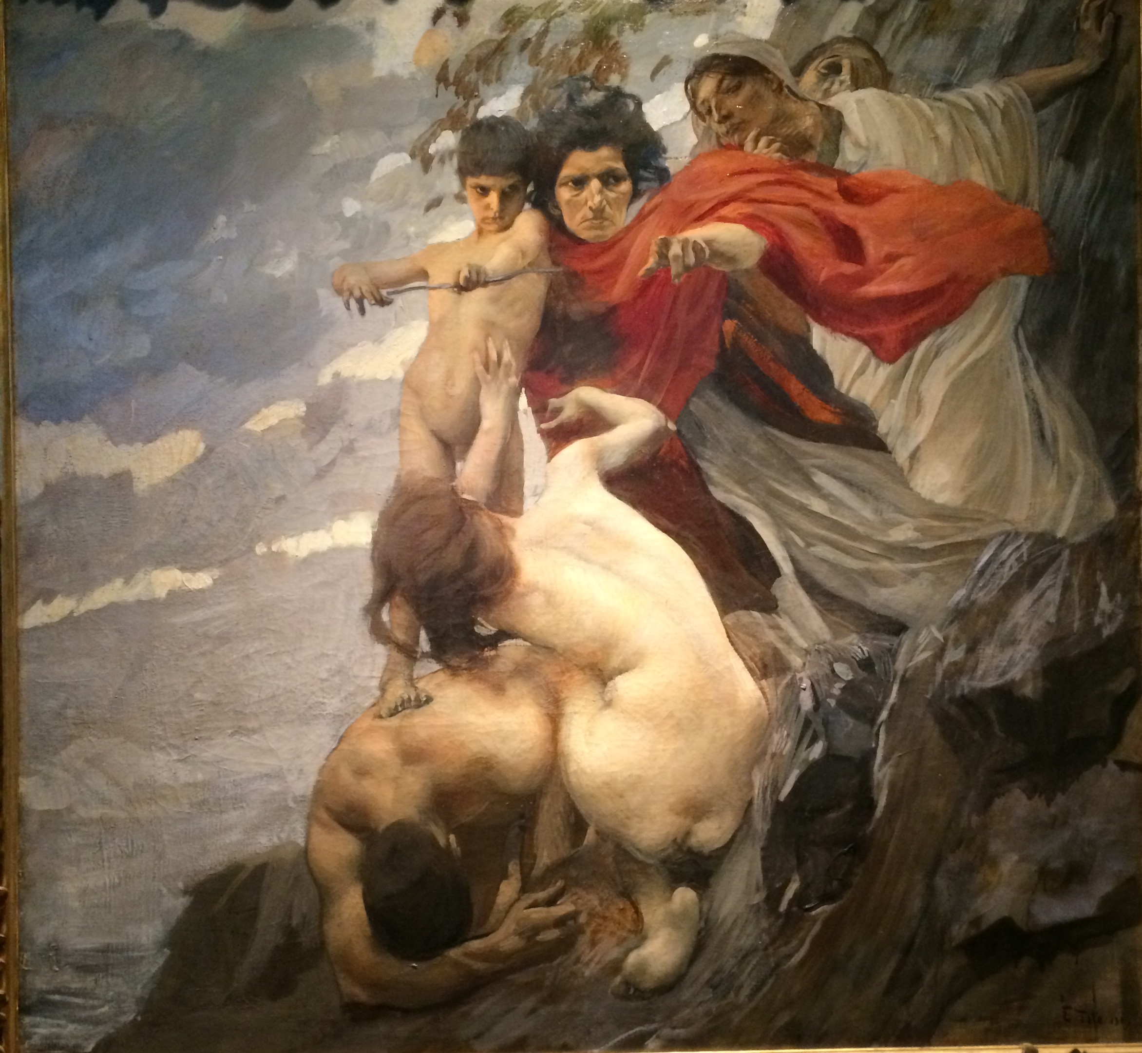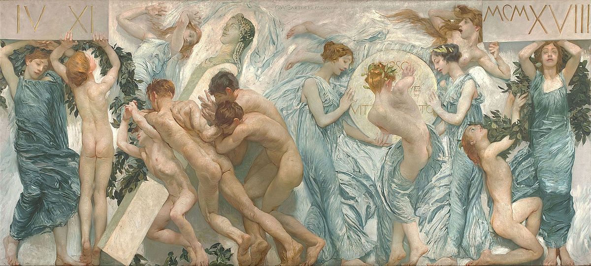 Другой пример с путти – это фриз для Народного Дома (1906, Галерея Берарди, Рим), созданный Джулио Аристиде Сарторио (1860–1932). В этой декоративной композиции римский художник изобразил путти, поддерживающих тяжелую гирлянду из листьев лавра, в совершенно иной стилистике, ассоциирующейся, в том числе из-за монохромности живописи, с античными рельефами. В созданных Сарторио образах одновременно сосуществуют академическая торжественность и изящество естественного движения. Очевидно, эта сцена символизировала надежду на движущую силу молодости.