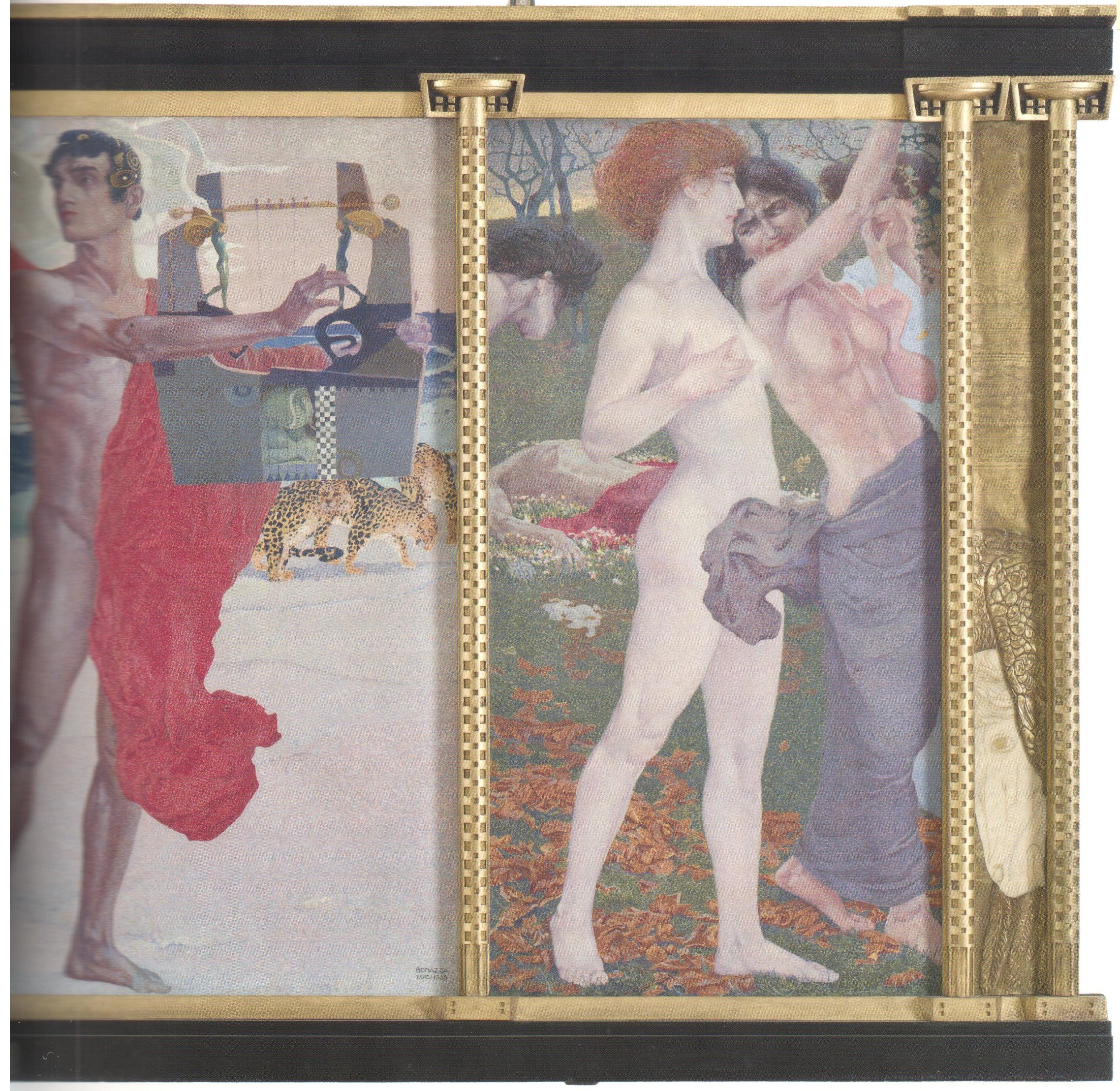 Среди других символистских произведений живописи академической направленности, также инспирированных античностью, следует выделить трехчастную композицию Луиджи Бонацца (1877–1965) «Легенда об Орфее», «Воскрешение Эвридики», «Смерть Орфея» (1905, Музей современного искусства Тренто и Роверето, Роверето)[15]. Стилистически она сопоставима с исканиями венских сецессионистов и представителей югендстиля, таких как Макс Клингер и Франц Штук. В пластическом языке этого произведения сочетаются элементы болонского академизма и декоративное упрощение формы под влиянием европейского модерна (ил. 8), в персонажах и композиционных приемах заметно влияние «Бетховенского фриза» (1902, Дом сецессиона, Вена) Густава Климта.