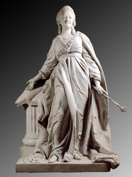 Такое качество Аполлона как светозарность, его непосредственная связь с солнцем должны были визуально транслировать идею власти просвещенной монархини, несущей свет разумных законов подданным. Бесстрастность лика и легкость шага означать божественную природу деятельности модели. Отсутствие сильных эмоций лишь подчеркивает манифестацию императрицы, хранящей благородное спокойствие. Соотнесение с мужским божеством усиливает героический характер образа. Вариацию этой телесной формулы можно видеть и в статуе «Екатерина II ‒ законодательница» (1789, ГРМ) (ил. 3) работы Федота Ивановича Шубина (1740‒1805), где жест опущенных ниже рук усиливает констатацию свершившегося деяния.