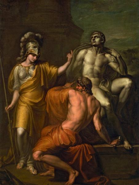 В картине формула повторена дважды в зеркальном развороте: в фигуре Прометея и в создаваемой им статуе. Герой в данном случае представлен в процессе творения, борьба рационального космоса с хаосом косной материи еще не окончена, хотя результат уже очевиден. Означаемое победы выражено в фигуре богини Афины, чья телесная формула, тоже может быть возведена к статуе Аполлона Бельведерского, утверждая высшую волю и власть. Развитие сюжета на уровне формул прочитывается как героическая борьба, победа в которой предопределена божественным светом мудрости.