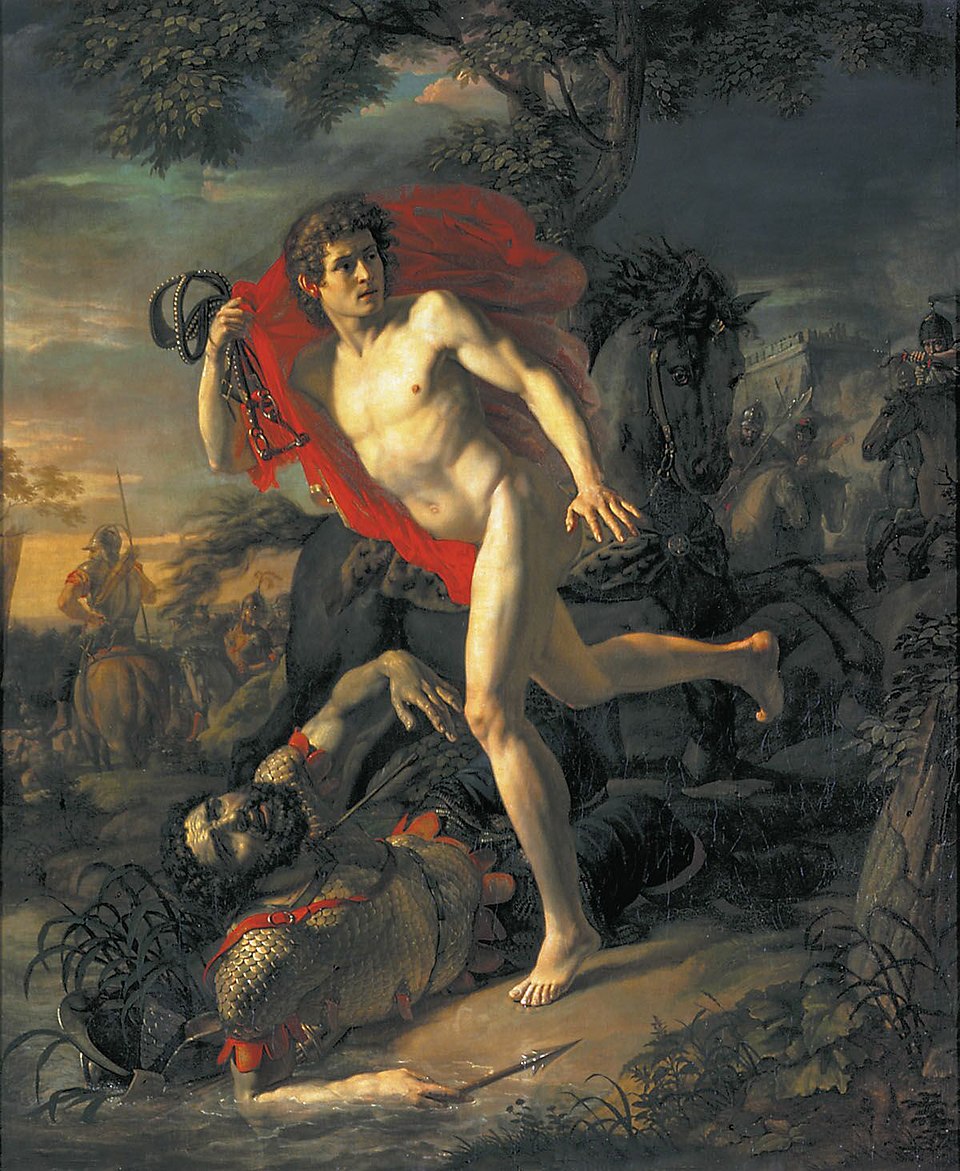 В картине Александра Андреевича Иванова (1806‒1858) «Приам, испрашивающий у Ахиллеса тело Гектора» (1824, ГТГ) (ил. 8) телесная формула борьбы, ясно считываемая в фигуре Ахиллеса, призвана обозначить момент мучительных колебаний героя между ненавистью к отцу убийцы его близкого друга и милосердием к старику, потерявшему сына.