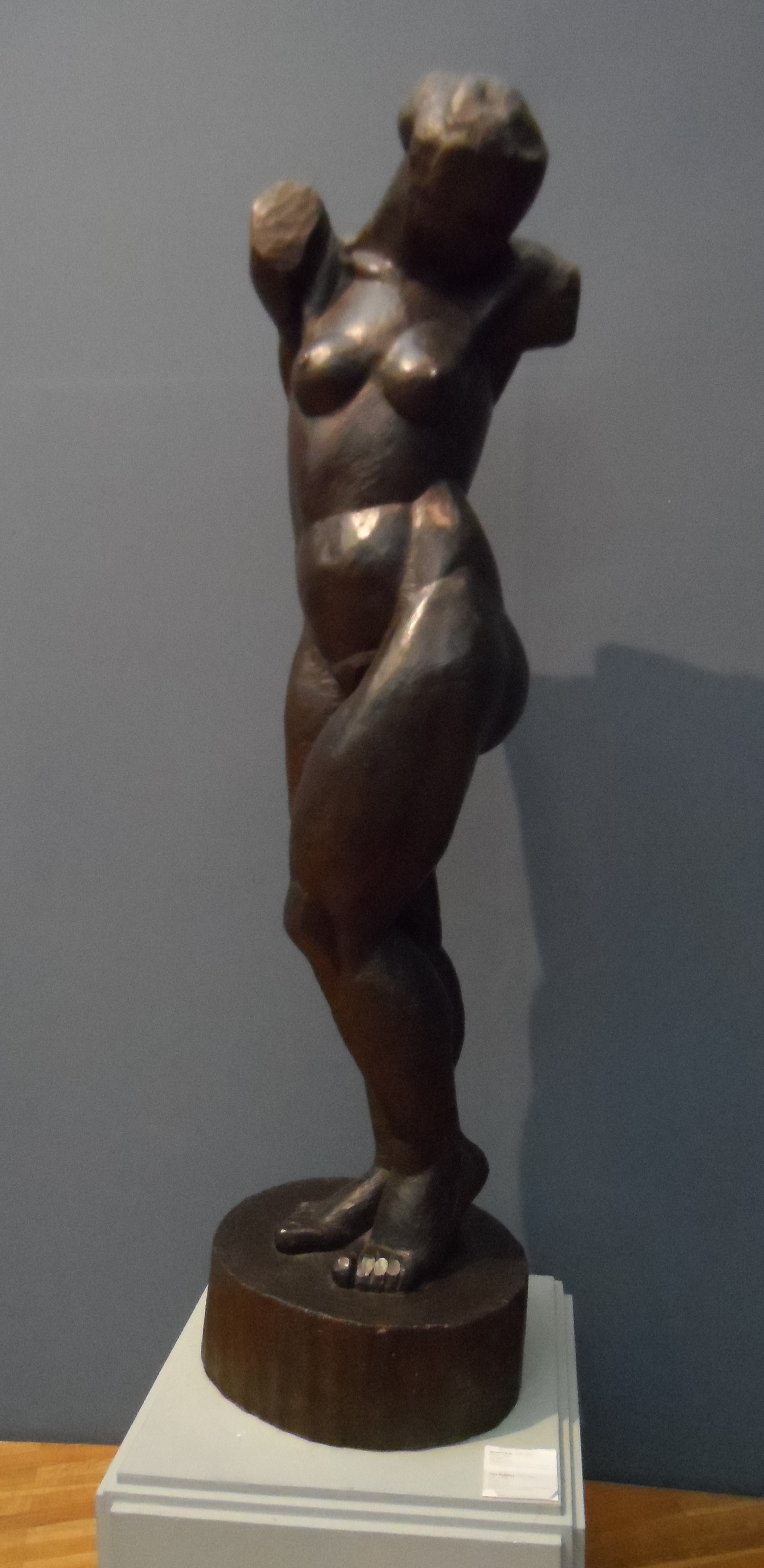 Вслед за экстатичной танцовщицей Рындзюнской можно вспомнить и работу Веры Мухиной «Юлия» (1925–1926, дерево, ГТГ). Для нее также позировала профессиональная балерина Юлия Подгурская (ил. 4). Хотя данное произведение вряд ли можно считать портретным в строгом смысле этого слова, поскольку лицо модели почти не проработано, а пропорции фигуры несколько изменены с целью усиления пластического движения массивных объемов, но скульптура представляет бесспорный интерес для раскрытия того насыщенного творческого диалога с античностью, который в данном случае предпринимает Вера Мухина. «Сама Мухина говорила о ней в 1940 году так: “Здесь еще сквозят остатки кубизма. Вон – коленки кубом. Я искала тогда весовые соотношения объемов. Физическое звучание объема. <…> “Юлия” – винт. У нее нет фаса, зада, боков. Она смотрится со всех сторон”» [Воронов 1989, с. 22].