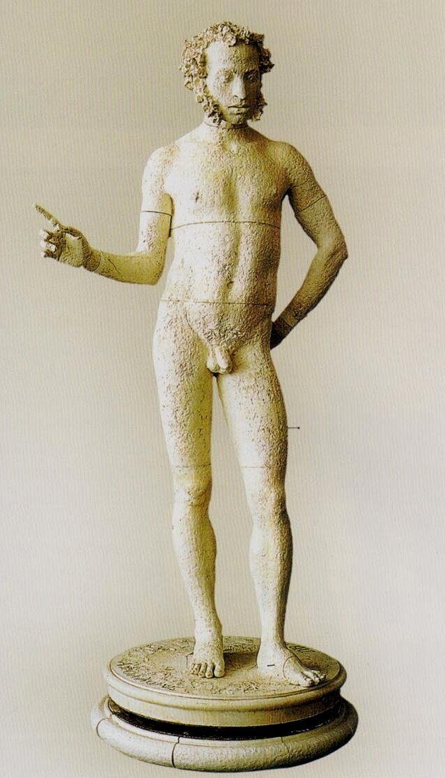 Наконец, бесспорную и тесную причастность к миру античных тем и образов продемонстрировал в своем творчестве Леонид Михайлович Баранов, что хорошо видно на примере целого ряда его работ, посвященных Александру Сергеевичу Пушкину (ил. 5). Одной из наиболее выразительных среди них является статуарная композиция «Пушкин в образе Аполлона» (1999, гипс, собственность семьи художника). Искусствовед и критик Сергей Орлов так говорит об этих произведениях: «Баранов часто изображает обнаженного Пушкина, представляет его как героя античной мифологии. Совмещаются реальный и воображаемый портреты. Сама пластика тела выражает возвышенность, совершенство поэтического дара <…>. Обнаженный Пушкин естественен как сама природа, он не нуждается в защитных покровах и оболочках. Любой костюм, любой стиль одежды временны, обнаженность – вечна» [Книга о Баранове 2004, с. 122]. Созданному Барановым образу созвучны такие хрестоматийно известные античные произведения, как «Аполлон Бельведерский» (около 330 г. до н.э., мрамор, Рим, Музеи Ватикана), «Эфеб с Антикитеры» (340-е гг. до н.э., бронза, Афины, Национальный археологический музей) и «Дорифор» Поликлета (середина V в. до н.э., бронза, Неаполь, Национальный археологический музей).