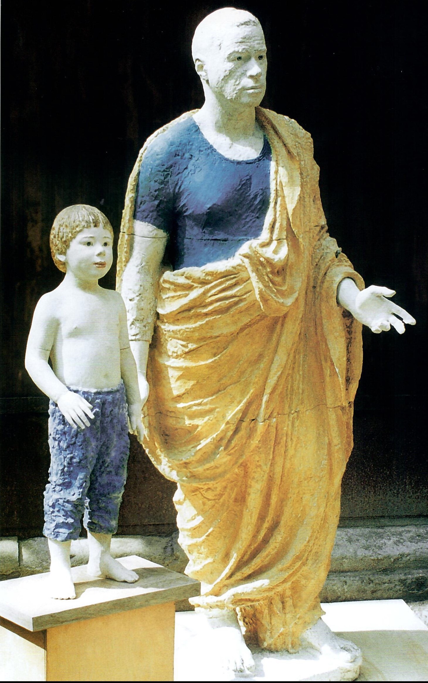 Подобные ностальгические сожаления совершенно не грозили скончавшемуся в 2022 году в расцвете творческих сил скульптору Леониду Баранову, о чем исчерпывающе говорит его крупномасштабная репрезентативная композиция «Петя и Леня. Автопортрет в тоге» (1988, 1993, гипс крашенный, собрание семьи художника), где мастер запечатлел рядом с собой старшего сына в детском возрасте (ил. 7). Уважительно отсылая нас к римской портретной скульптуре, наглядным примером которой может служить «Патриций с портретами предков. Статуя Барберини» (конец I в. до н.э., мрамор, Рим, Капитолийские музеи), Баранов в очередной раз доказывает, что мир античных образов – это совершенно родная и хорошо знакомая ему территория.