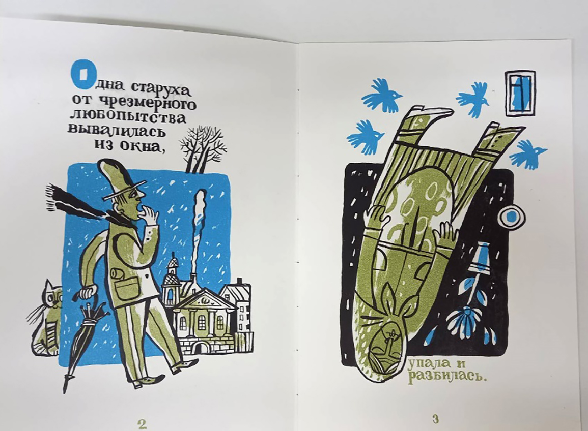 Заметной удачей стали также проект Дарьи Самойловой, посвященный творчеству поэтов-обериутов, и небольшая книжка Дианы Некрасовой «Зеленый зверь». Формат livre d’artiste выдержан в обоих случаях, несмотря на различие пластического языка и подхода к визуализации текстов (ил. 15, 16).