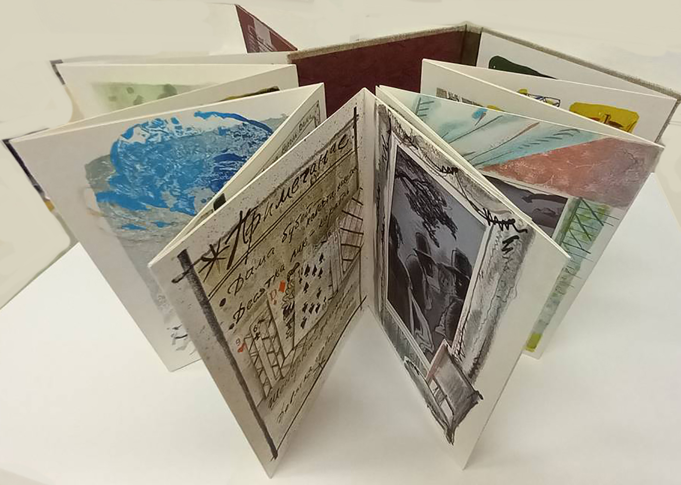 В контексте темы стоит рассмотреть и авторские книжные проекты, генетически связанные со станковыми сериями или обладающие специфической экспозиционной формой. Серия «Книга судеб» содержит три станковых листа и книгу-гармошку с авторским текстом, двусторонней печатью и интерактивными элементами (вырубки, возможность переставлять страницы местами) (ил. 6).
