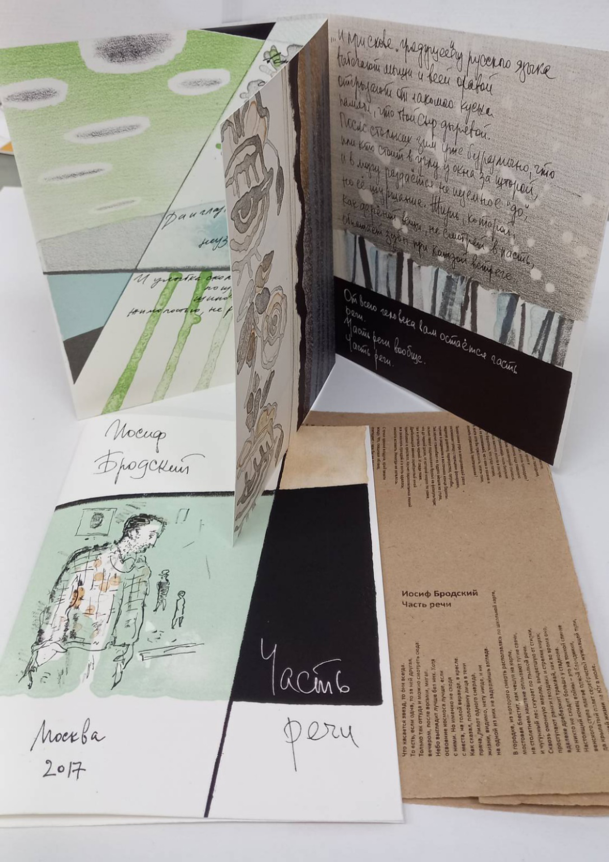 Небольшая книжка с поэтическим циклом И.А. Бродского «Часть речи» уже приближается по форме к классической livre d’artiste – она не сшита, обернута в свободную суперобложку (ил. 7).