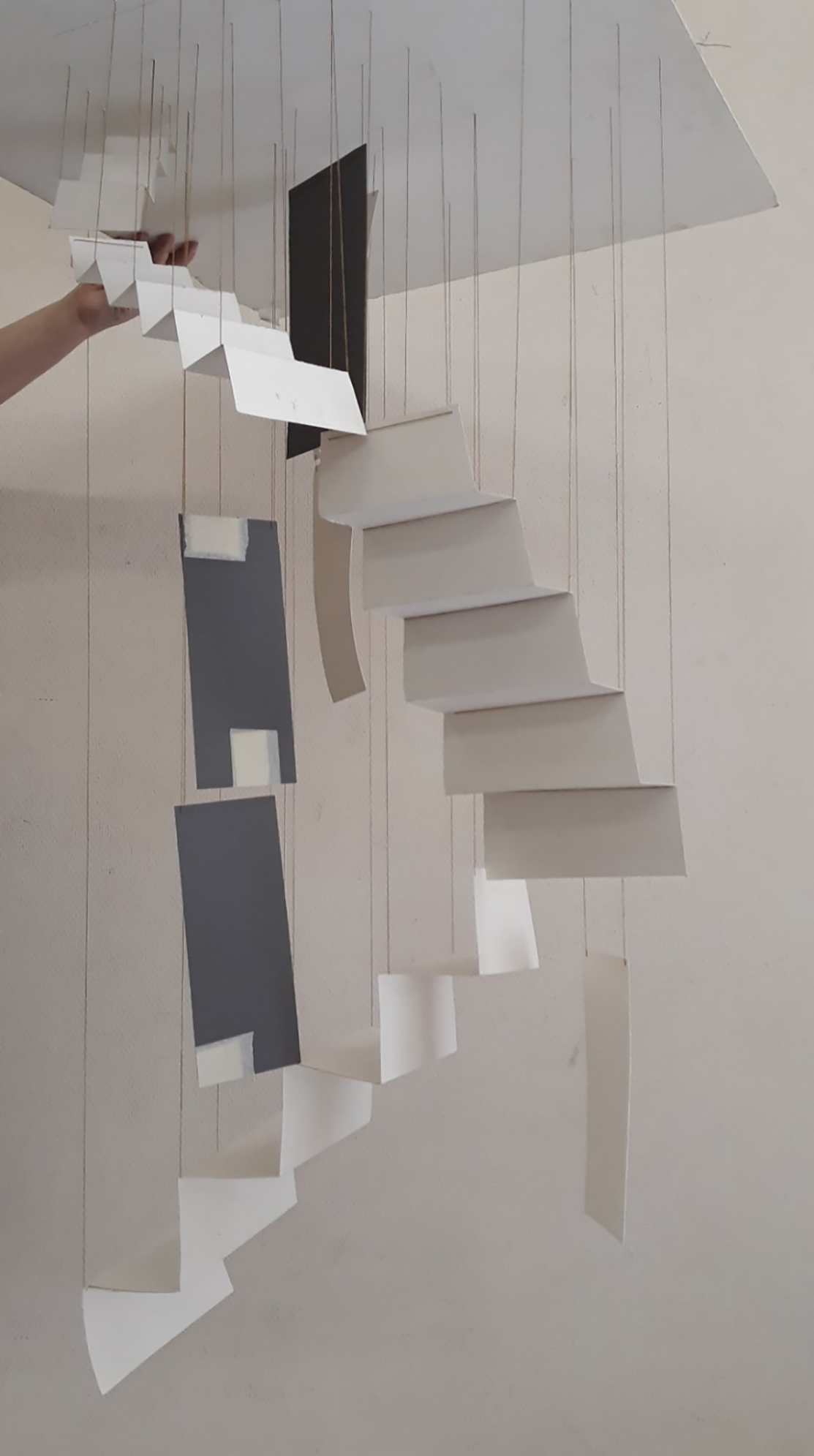 Вторая работа, связанная с творчеством этого же поэта, напротив, получилась очень масштабной, практически архитектурой из бумаги, поскольку предполагает экспонирование в виде объекта ‒ лестничного колодца со ступенями и окнами, но в то же время в сложенном виде имеет вид книги. При всей сложности композиции в этой работе уже строго выдержаны требования к жанру livre d’artiste – книга не сшита, имеются отдельные титул и колофон, специально изготовлен футляр авторского дизайна. За основу взято раннее стихотворение И.А. Бродского «Одиночество», пластический ряд построен на имитации рукописного шрифта и фактуры ступеней лестницы, и только иллюстрации-«окна» условно фигуративны (ил. 8, 9).