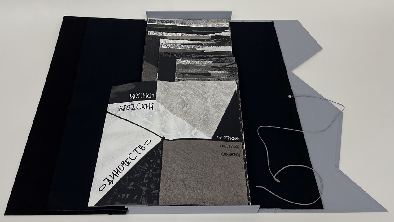 Например, книга Евгения Погорелова с циклом стихов Иосифа Бродского «К северному краю» имеет два выставочных варианта – один привычно сшит в тетрадку, другой напечатан на разрозненных листах старого фотоальбома, который придает восприятию некую винтажную документальность. Кроме того, фигуративные сюжеты умышленно перекликаются со станковой серией «Дорога», поскольку автор работал над этими листами параллельно с книгой, тем самым раскрывая выбранную тему с разных точек зрения и различными пластическими средствами (ил. 5).