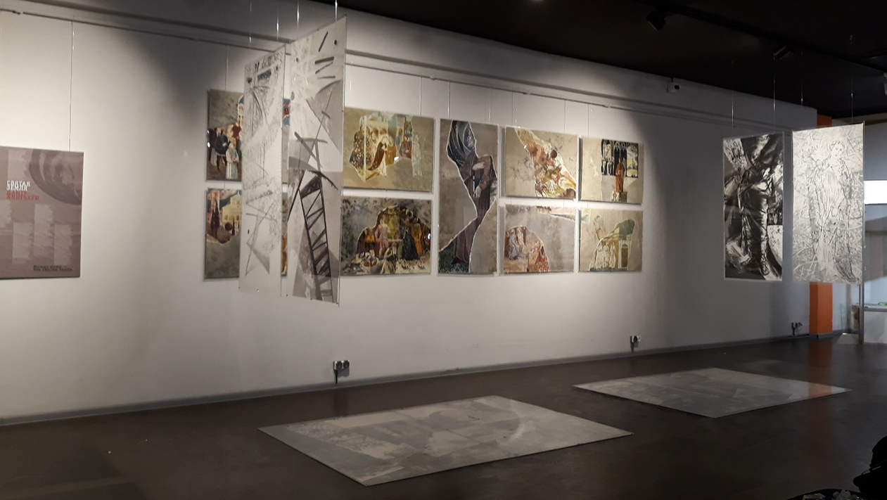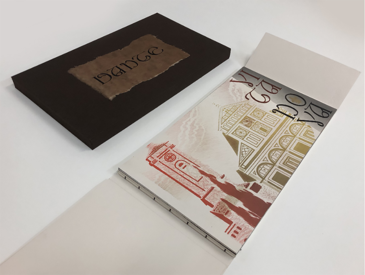 Еще более крупным проектом, содержащим книгу в жанре livre d’artiste, стал авторский выставочный проект «Святая земля Данте Алигьери». Цикл состоит из 21 станкового листа и книги «Новая жизнь», напечатан на разных сортах бумаги, при экспонировании воссоздает пространство иллюзорного помещения с фресками на стенах и каменными рельефами на полу. Сама книга полностью соответствует стандартам жанра livre d’artiste и содержит элементы самоцитирования фигуративных фрагментов, взятых из больших станковых листов, таким образом становясь неотъемлемой частью всей выставочной идеи (ил. 10, 11).