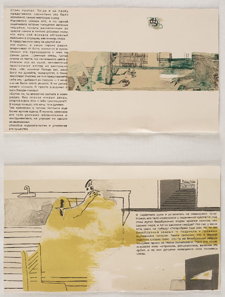 Кроме того, за полтора десятка лет руководства литографской мастерской Московского государственного академического художественного института имени В.И. Сурикова многие дипломники и недавние выпускники обращались к этому жанру, часто рассматривая формат livre d’artiste как часть единой выставочной идеи рядом со станковыми произведениями, а иногда и живописью, и керамикой. Пожалуй, самым ярким примером может послужить большой проект Дарьи Фетисовой «Дом силы», содержащий большие холсты, станковую серию в технике литографии, керамические объекты и книгу в жанре livre d’artiste (ил. 13, 14).