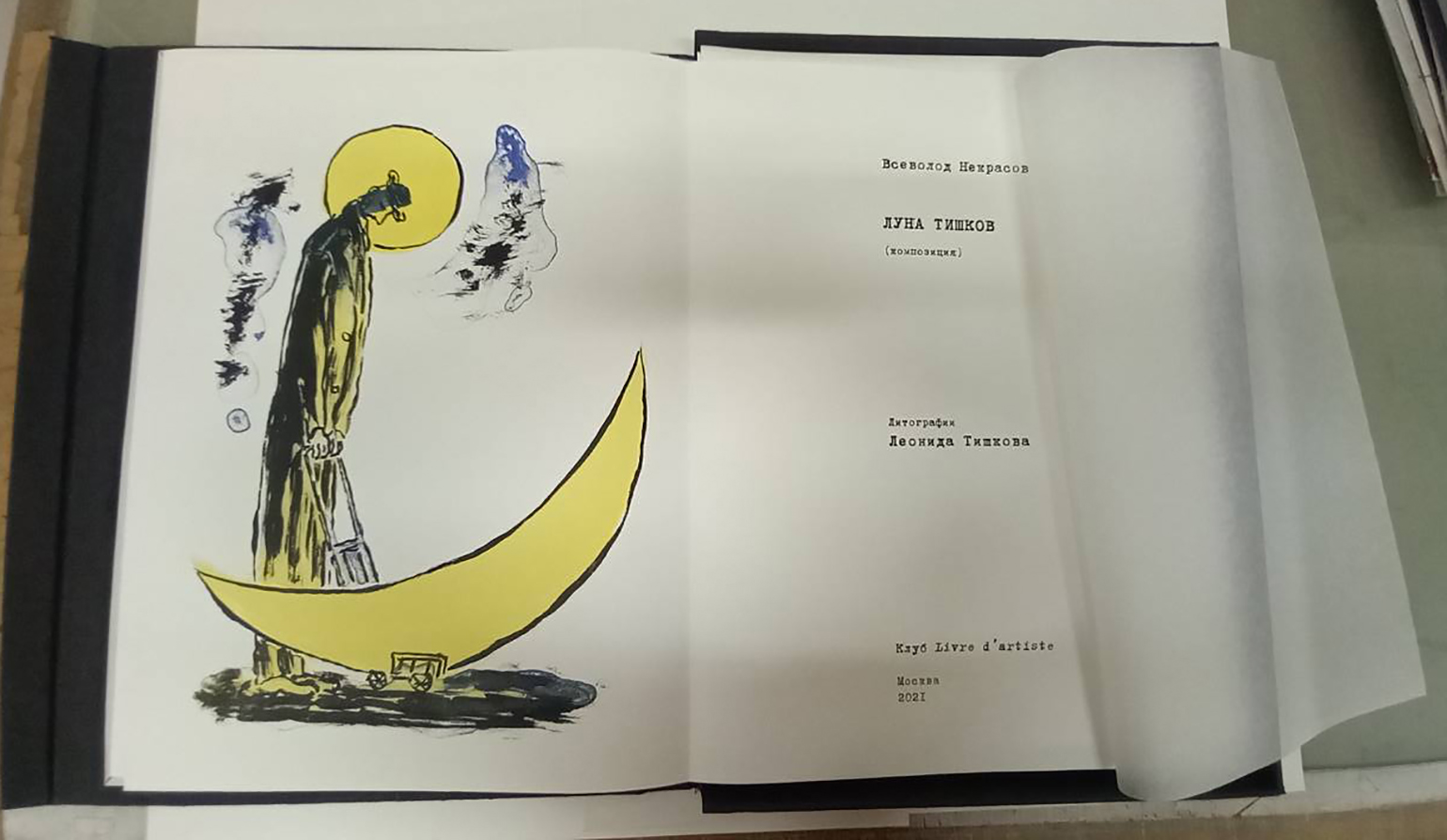 Работа Леонида Тишкова «Луна Тишков» на основе одноименной поэмы Всеволода Некрасова содержит 5 цветных литографий и фронтиспис. Стиль художника узнается сразу, кроме того, для Л.А. Тишкова эта работа стала в какой-то мере возвратом к его литографским книгам 1980-х‒1990-х годов, многие из которых, кстати, были напечатаны в этой же мастерской (ил. 20).
