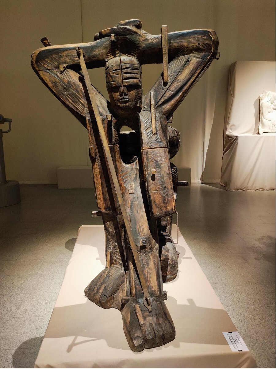 Дмитрий Давыдович Каминкер начинал свой творческий путь, занимаясь изготовлением каркасов для скульптур мэтров советской пластики. Силовые линии, выявленные в каркасе, являются одним из излюбленных приемов мастера. Интересно, что с ним тесно связан его оригинальный подход к дереву как накладываемому материалу. Здесь уместно вспомнить, что и Матвеев относился к материалу, прежде всего, как к выразительному средству, технически, без увлечения фактурой. «Заложник» (1988) (ил. 6) – несомненно, значительное произведение, в котором в полной мере раскрывается совершенство образного мышления мастера.